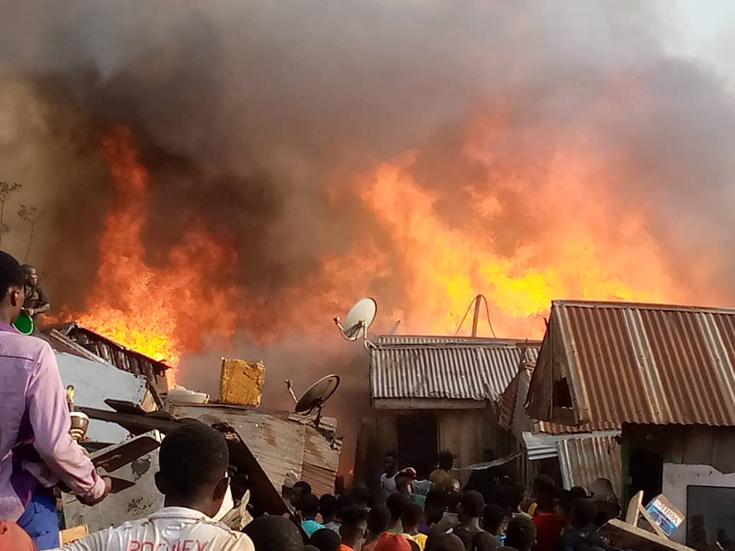 Dagombaline , a slum is mostly inhabited by scrap dealers and head potters popularly called Kayayies. Several wooden structures belonging to the squatters were burnt into ashes .