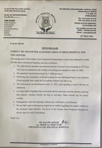 The management of the Greater Accra Regional Hospital denies a news item making the rounds with the above-mentioned headline, and says as follows: