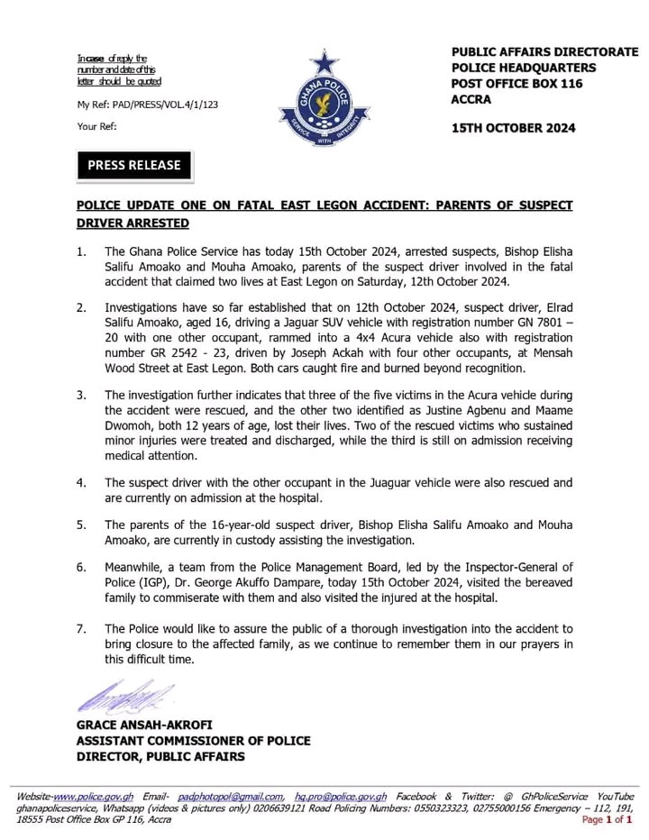 Their arrest follows an accident caused by their 16-year-old son, Elrad Salifu Amoako, which resulted in the deaths of two people. The accident occurred at East Legon in Accra on Saturday, October 12, 2024.