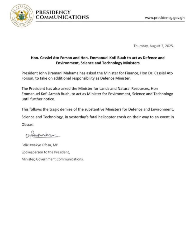 The presidential directive was confirmed by spokesperson Felix Kwakye Ofosu, who stated: “President John Dramani Mahama has asked the Minister for Finance, Hon Dr. Cassiel Ato Forson, to take on additional responsibility as Defence Minister. The President has also asked the Minister for Lands and Natural Resources, Hon Emmanuel Kofi Armah Buah, to act as Minister for Environment, Science and Technology until further notice.”