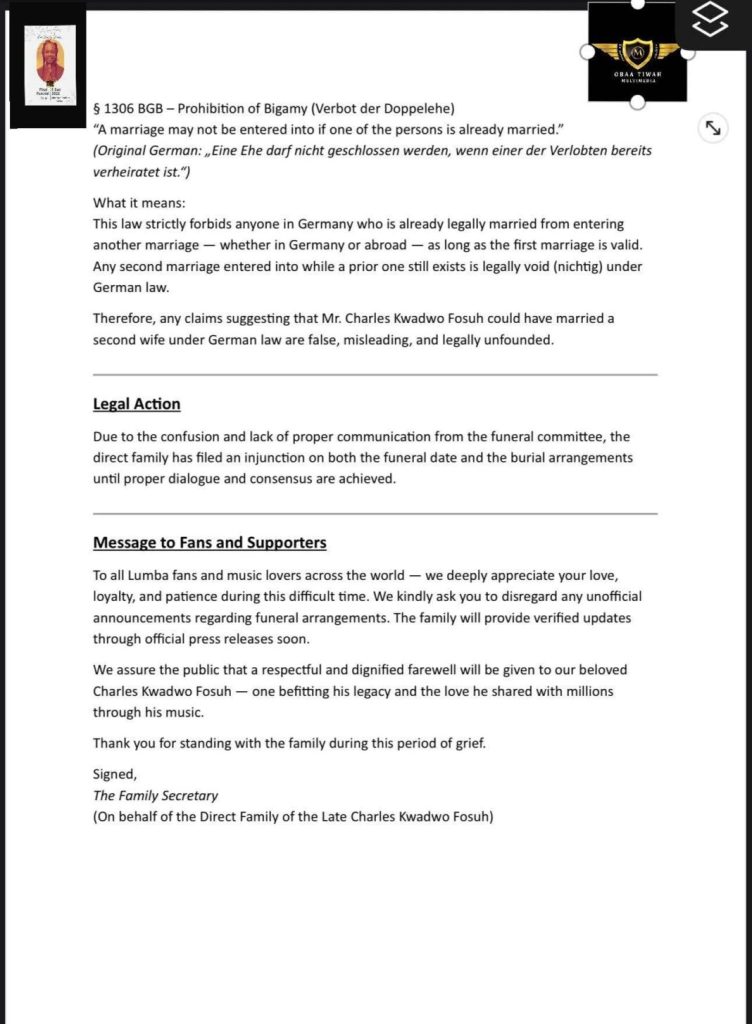 It also reminded the public that Daddy Lumba was legally married to Akosua Serwaa on December 23, 2004, in Bornheim, Germany, where bigamy is prohibited by law.