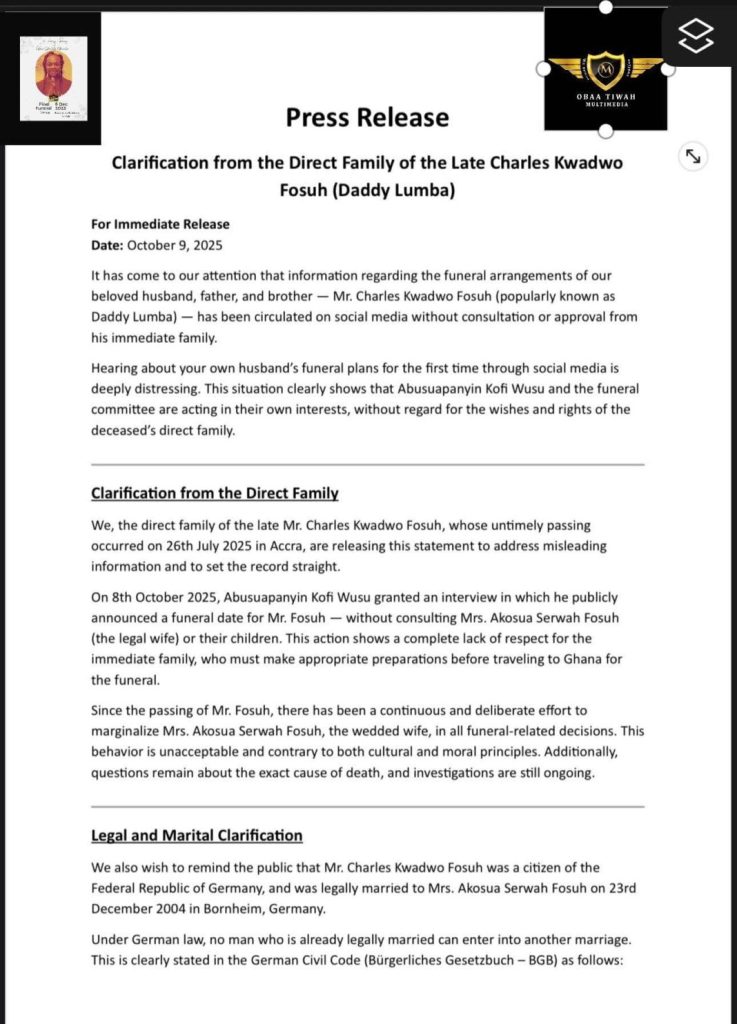 In a separate statement, members of the musician’s “direct family” confirmed that legal measures were underway to suspend the funeral until proper discussions were held. They alleged that since Daddy Lumba’s death on July 26, 2025, there had been a “continuous and deliberate effort to marginalise” his wife in all matters concerning the funeral.