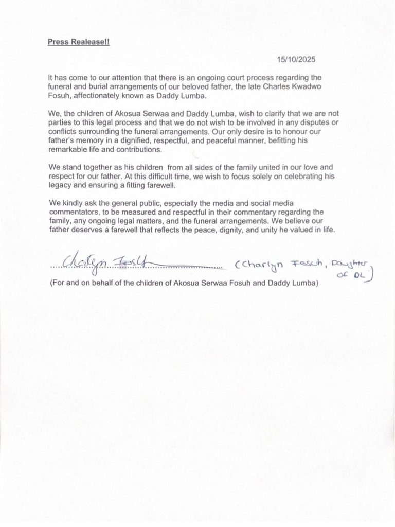 “We, the children of Akosua Serwaa and Daddy Lumba, wish to clarify that we are not parties to this legal process and that we do not wish to be involved in any disputes or conflicts surrounding the funeral arrangements,” the statement read.