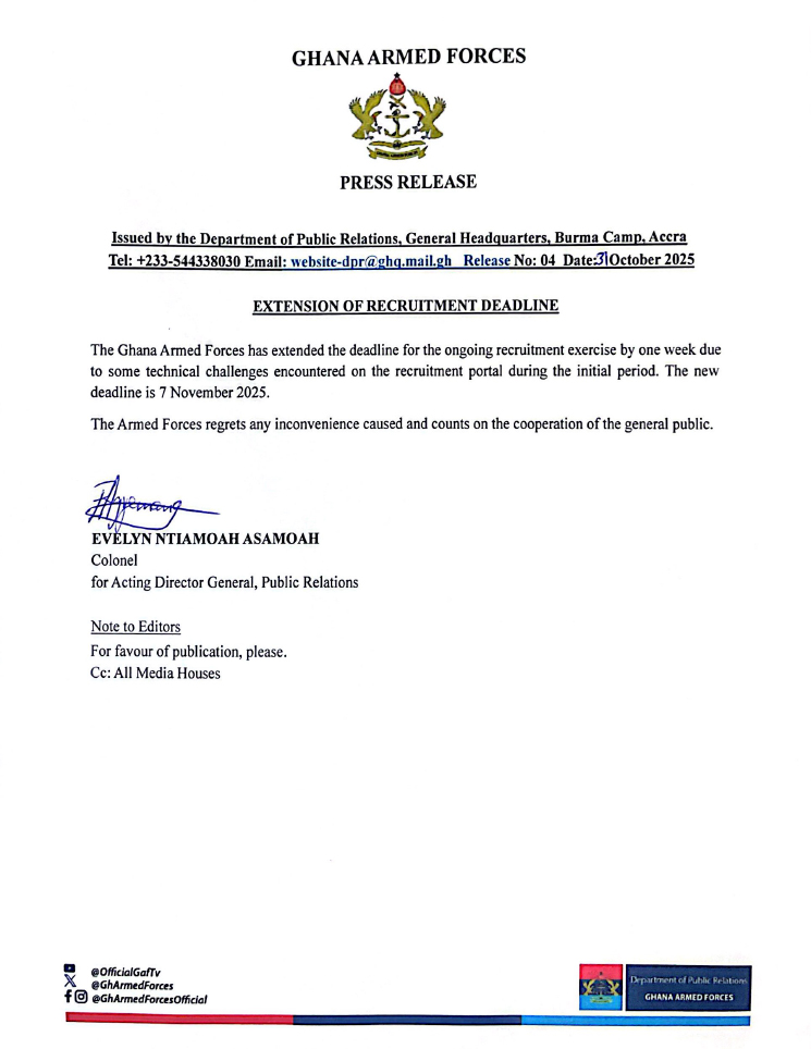 “The Ghana Armed Forces has extended the deadline for the ongoing recruitment exercise by one week due to technical challenges encountered on the recruitment portal during the initial period. The new deadline is November 7, 2025,” the statement read.