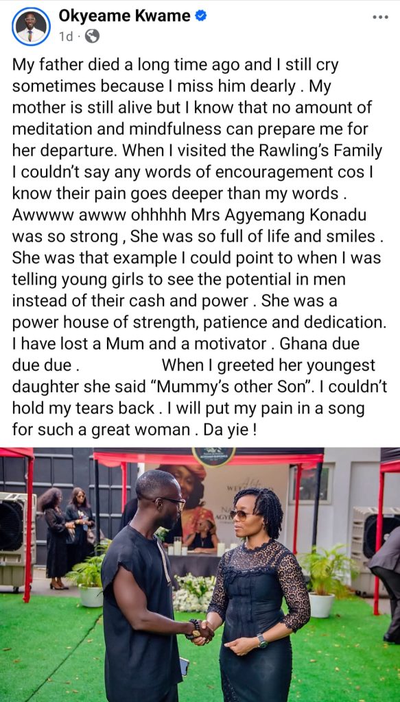 Kwame painted a vivid picture of Nana Konadu’s strength and warmth. “Awww awww ohhhhh Mrs. Agyemang Konadu was so strong. She was so full of life and smiles. She was that example I could point to when I was telling young girls to see the potential in men instead of their cash and power. She was a powerhouse of strength, patience, and dedication,” he said.