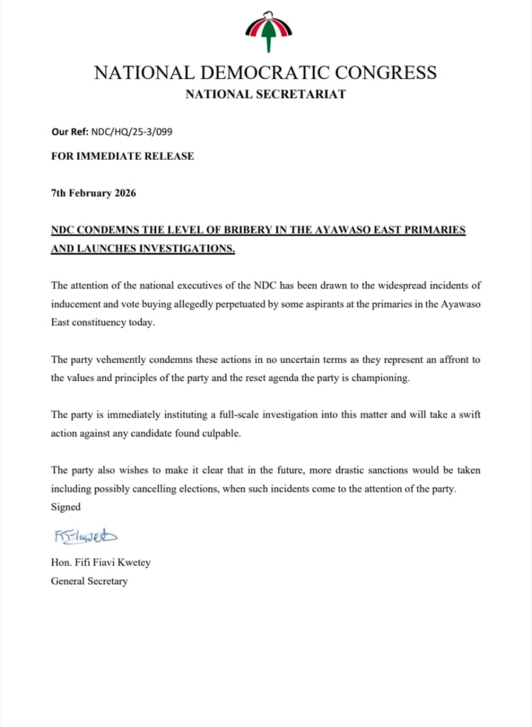The National Democratic Congress (NDC) has opened investigations into alleged bribery and vote inducement linked to its parliamentary primaries in the Ayawaso East Constituency, strongly rebuking the conduct and warning of sanctions against those found responsible.