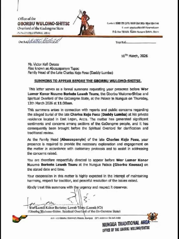 A letter issued on March 10, 2026, by the office of Gborbu Wulomo-Shitsɛ of the Nungua Traditional Area instructs Owusu to present himself before Wor Lumor Konor Nuumo Borkete Laweh Tsuru at the Nungua palace on March 13, 2026, at 11:30 a.m.