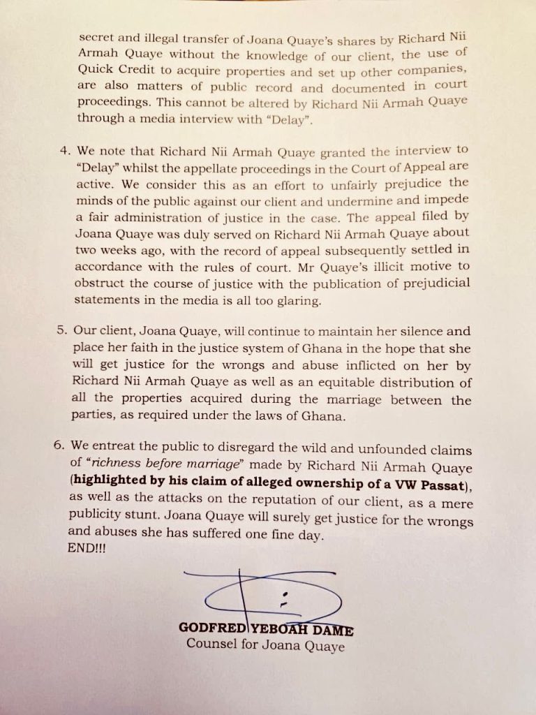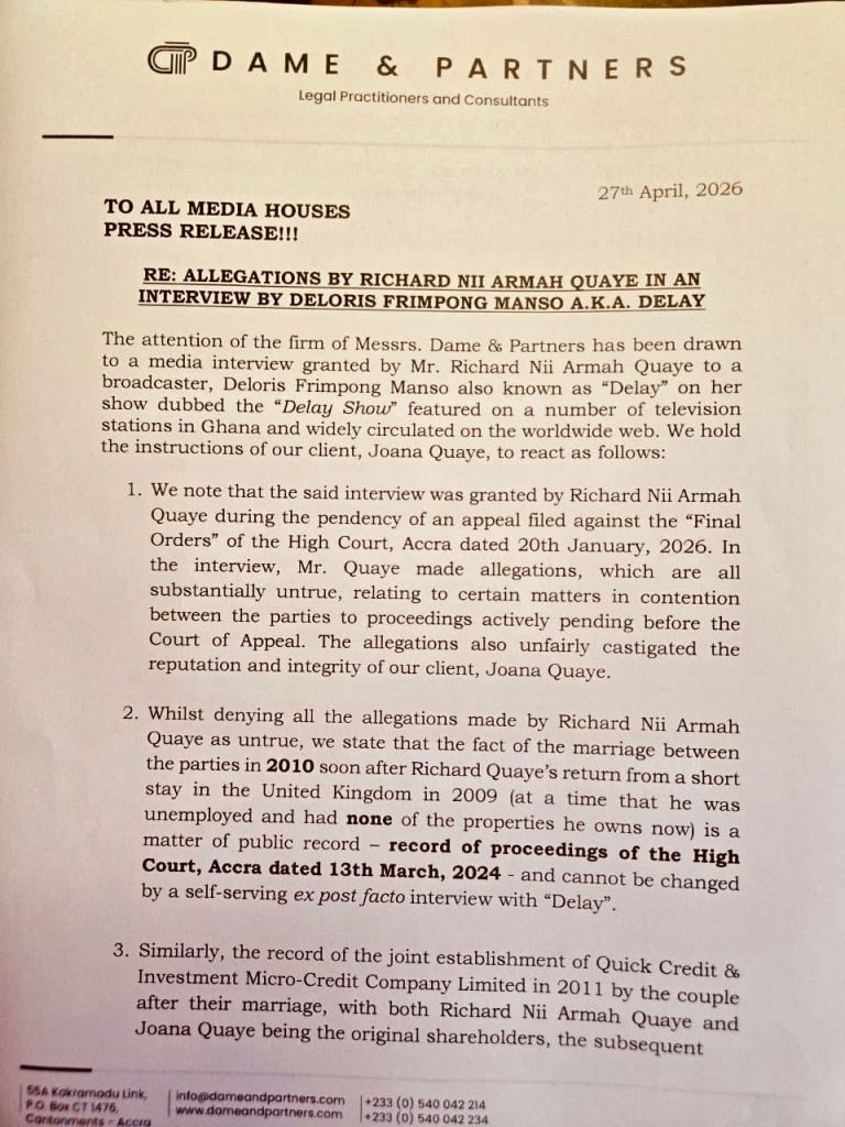 Dated April 27, 2026, and issued by Dame & Partners, the legal team representing Joana Quaye rejected several assertions made by Mr. Quaye during his widely shared conversation with media host Deloris Frimpong Manso.
