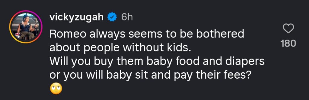 Zugah did not hold back when she reacted on Instagram. “Romeo always seems to be bothered about people without kids. Will you buy them baby food and diapers or you will baby sit and pay their fees? 🙄” she wrote, pushing back against what she sees as unnecessary pressure placed on women.