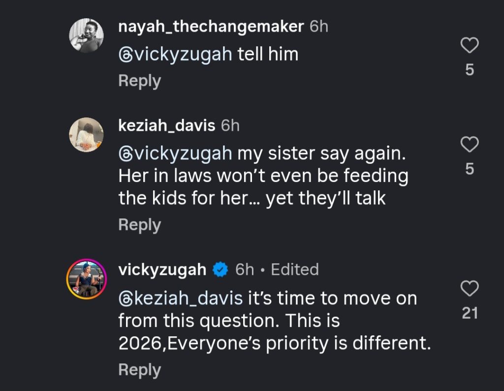 Her post struck a chord with followers. Among those who responded was Instagram user @keziah_davis, who wrote: “@vickyzugah my sister say again. Her in laws won’t even be feeding the kids for her… yet they’ll talk”